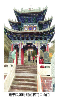 來(lái)到石廟山下,新建成的石門口山門屹立在眼前,它雄偉挺拔,氣勢(shì)軒昂,牙檐高啄,畫棟雕梁,直插云天。臺(tái)階兩旁的漢白玉護(hù)欄上蛟龍騰空,流云飛繞。山門兩側(cè)的兩只白玉石雕獅子,威武雄壯,神態(tài)各異,似在相互對(duì)望。檐角上的風(fēng)鐸,迎風(fēng)擺動(dòng),叮咚作響,閉目靜聽,更覺(jué)空靈飄逸,令人遐想萬(wàn)千。抬頭仰望梁間彩繪,色調(diào)鮮明,精湛美觀。上面雕有約1米大小的九位神仙,正中為南極真君老壽星,兩側(cè)是民間神話傳說(shuō)中的八仙。山門上靛藍(lán)的底色映襯著“石門口”三個(gè)金字,樸拙渾厚,蒼勁有力。