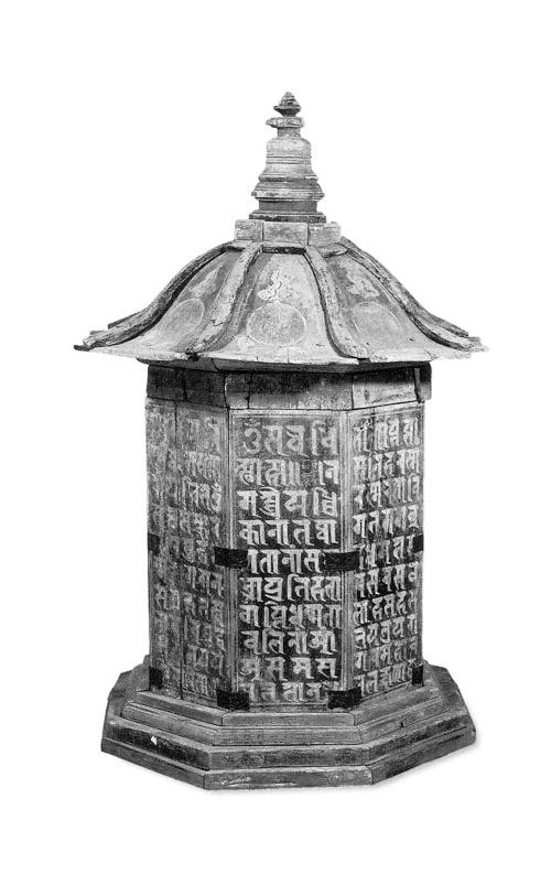 西夏木緣塔為西夏墓葬中第一次發(fā)現(xiàn)的西夏葬器。該塔通高75厘米,塔頂邊沿寬47厘米,呈四層八角形,飾紅色;分塔座、塔身、塔頂和塔剎四部分。塔座為四級(jí)八邊臺(tái)階。塔身為八邊柱體形,由長(zhǎng)34厘米、寬12.5厘米、厚2厘米的八塊木板合成,表面涂藍(lán)色,每邊有黃色工整梵文“陀羅尼”,并用漢文注明陀羅尼經(jīng)名。塔頂為傘式八邊形,每邊彩繪云氣紋和一個(gè)梵文字,內(nèi)有墨書(shū)“故考任西經(jīng)略司都案劉德仁,壽六旬有八,于天慶五年歲次戊午四月十六日亡歿,至天慶七年歲次庚辰(申)口夏十五日建緣塔,至中秋十三日入課訖”。塔剎圍欄為八邊形,其他相輪、覆缽、剎頂都是圓形,由下向上收分;底座周?chē)L有卷草紋。