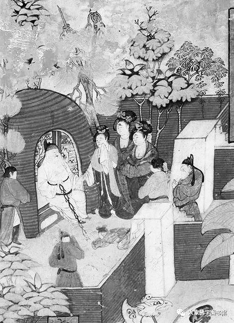 榆林窟第25窟《老人入墓圖》中,老人頭戴透額羅帽,著圓領(lǐng)白袍服,足蹬軟鞋,拄鏤空杖,安詳?shù)刈谀勾采希睬坝谢¢T裝飾,墓內(nèi)掛山水屏風(fēng)畫。老人與親屬執(zhí)手告別,親屬八人均痛苦不堪,或用巾拭淚,或以袖掩面,或趴地叩拜。