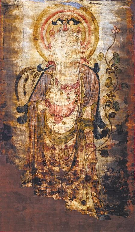 此像雖然褪色嚴(yán)重,殘缺不全,卻是敦煌絹畫中極為精美的佳作。觀音菩薩面朝前方,腰肢微扭,左肩前傾。面部輪廓清晰雅致,大耳垂肩,雙目微斂,神態(tài)慈悲安詳。右手持柳枝,左手提凈瓶,彎曲的長莖從瓶口伸出,蓮莖與觀音的站姿相呼應(yīng),搖曳向上在左肩上方開出一朵含苞紅蓮。畫面右下方跪有持蓮花女供養(yǎng)人像二身,她們衣著發(fā)型簡樸。其邊緣和畫面下部缺損嚴(yán)重,上部和兩側(cè)保存較完整,左上角長方形榜題呈空白。整幅畫面造型柔美繁復(fù)、勾勒緊勁嚴(yán)謹(jǐn),衣帶翻轉(zhuǎn)飄舞,線條行云流水,疏密有致,加之斑斕的色彩,令畫面熠熠生輝。