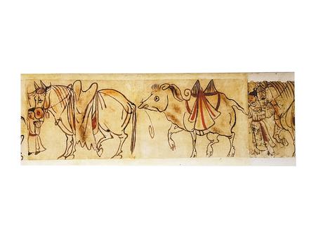 畫中描繪的是一匹馬和一頭雙峰駝,馬前有一位牽引的人,駝后畫面斷開,右端后續(xù)殘畫可見又一牽馬之人(人與馬均不完整)。