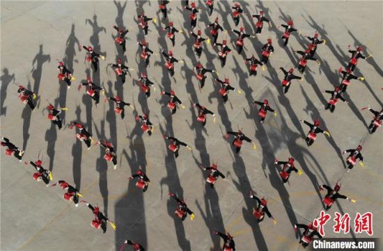 圖為甘肅武威市涼州區(qū)四壩鎮(zhèn)九年制學校的學生練習攻鼓子。 楊艷敏 攝