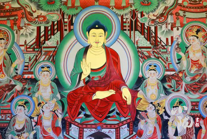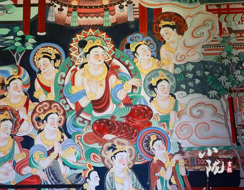 該壁畫是按照敦煌莫高窟第220窟唐代《無量壽經(jīng)變》壁畫為原型,選址鳩摩羅什寺旃檀佛殿正面墻體,由敦煌畫院畫師張杰龍臨摹再創(chuàng)作,融入了敦煌莫高窟唐代112窟壁畫局部經(jīng)變內容,與原作既有相似,但又不完全是原作。
