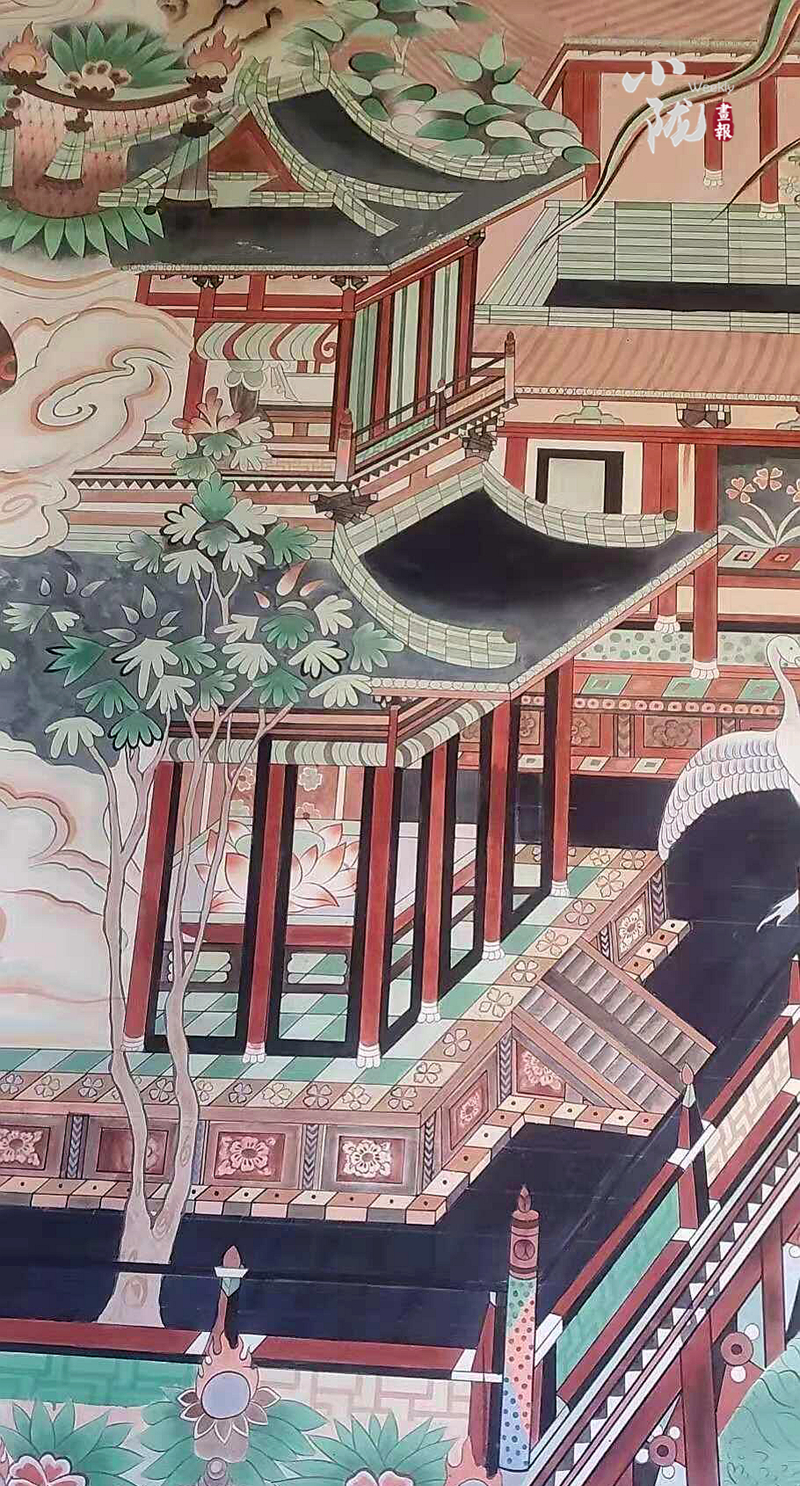 壁畫中,飛舞著的樂器代表十方世界的妙音,精舍、宮殿、樓宇、樹木、池水皆為七寶莊嚴自然化成,所有的天人都置身于碧波蕩漾的七寶池中,整潔有序,清凈安詳。雖是描寫佛教極樂世界的宏大場面,但卻是以人間園林建筑景物為藍本,既有亭臺樓閣,又有綠樹寶池,顯得宏偉壯麗。整幅壁畫融入了敦煌壁畫的精神魅力,具有很強的藝術價值和觀賞價值。