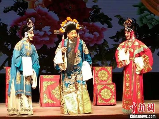 2月中旬,中新網記者采訪甘肅省級非遺傳承人趙希順。圖為趙希順(左二)登臺表演隴劇?!「拭C省隴劇院供圖