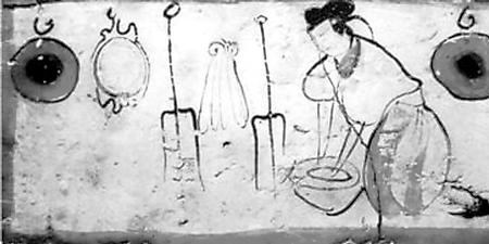 糧食、蔬菜品種與前代相比沒有大的變化,仍是漢地人的主要經(jīng)濟(jì)和衣食來源。烹飪方法,這一時(shí)期出現(xiàn)了面粉發(fā)酵技術(shù)。北魏賈思勰介紹發(fā)面技術(shù)說:“面一石,白米七八升作粥,以白酒六七升酵中,著火上,酒魚眼沸,絞去滓,以和面,面起可作”(《齊民要術(shù)》卷9)。把北魏時(shí)期的容量數(shù)換算成今天的市斤,上段話的意思就是,用五十多斤面粉,五六斤白米做粥,再用四五斤白酒(甜米酒)做酵母,將酒架火上燒至發(fā)出魚眼樣的小泡后,濾去酒渣,加入面粥中發(fā)酵,等面發(fā)起后就可以做餅了。這是一項(xiàng)歷史性的烹飪技術(shù)。從發(fā)面的數(shù)量看,一次發(fā)這樣多面的家庭,至少有三五十口人,顯然是當(dāng)時(shí)世家大族的人口規(guī)模。世族如此,普通民眾也應(yīng)很快就學(xué)習(xí)掌握了發(fā)面技術(shù)。