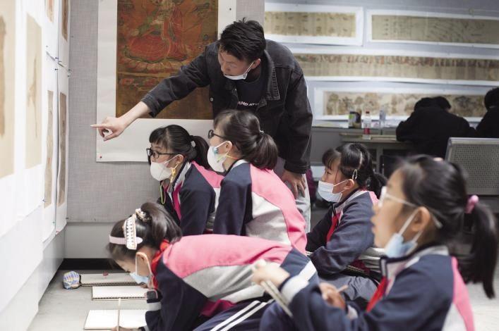 小學(xué)生近距離學(xué)習(xí)敦煌畫(huà)作 圖片由西北師范大學(xué)提供