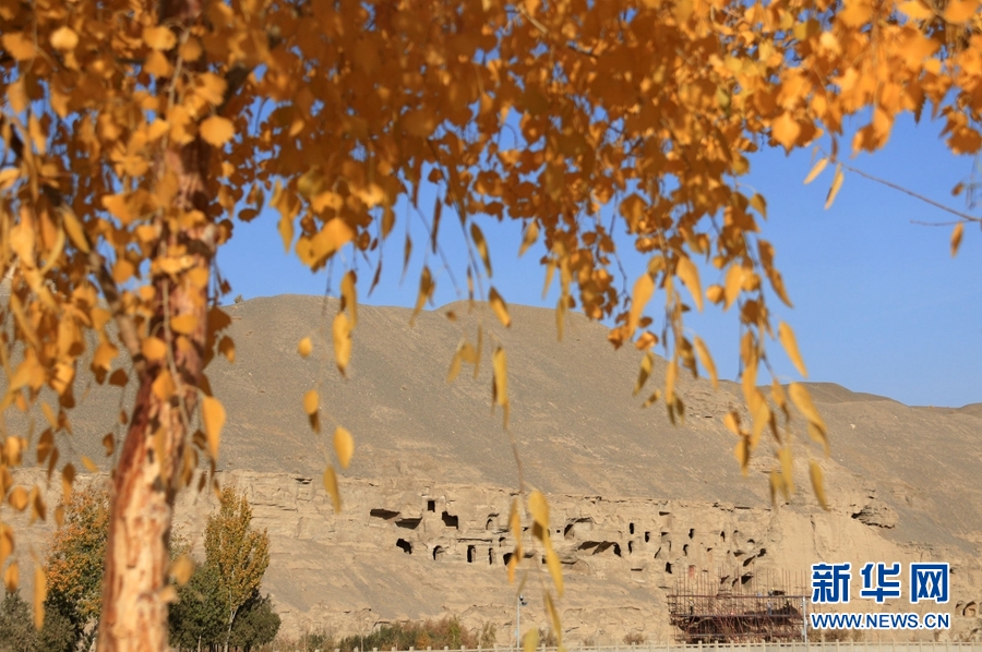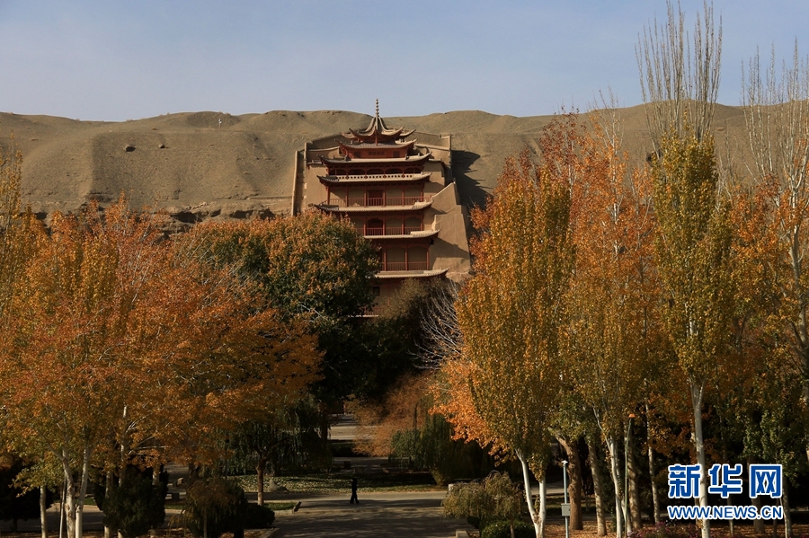 深秋時節(jié),世界文化遺產甘肅省敦煌市莫高窟盡染秋色,景色迷人,美不勝收。