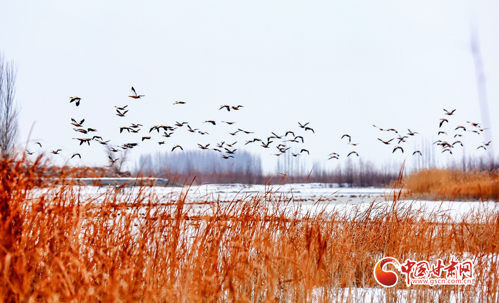 12月20日,在甘肅省酒泉市銀達(dá)鎮(zhèn)花園水庫,一群候鳥正在戲水、覓食,為祁連山下的戈壁大地增添了一道亮麗的景色。