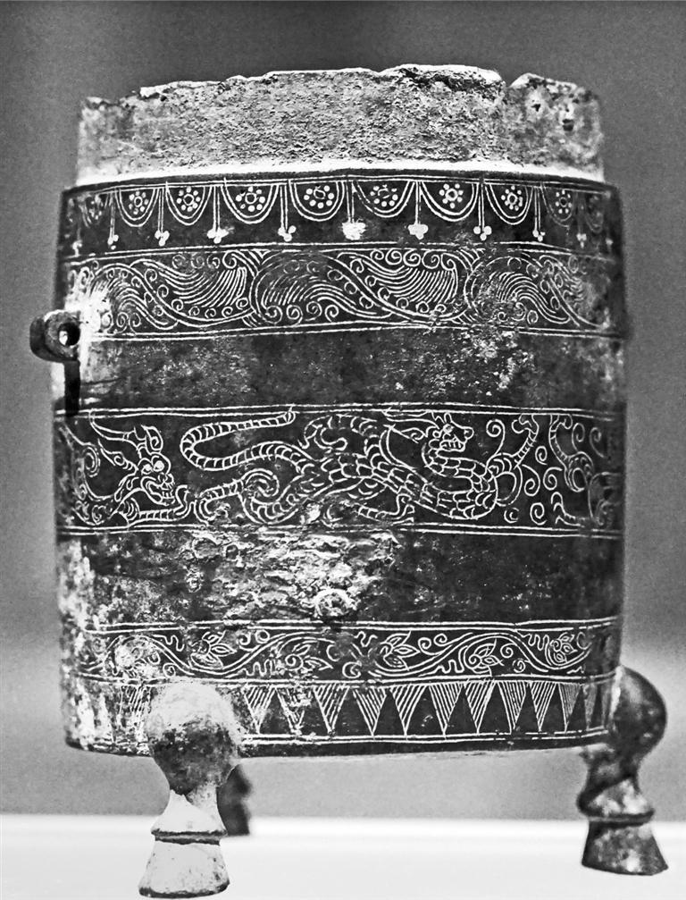 這件金錯(cuò)泥筩,是目前發(fā)現(xiàn)的唯一一件可以確定的、與前涼張氏王族有關(guān)的宮廷用器。征集于西安,可能是公元376年,前涼末主張?zhí)戾a投降前秦后前往長(zhǎng)安時(shí)帶去的。