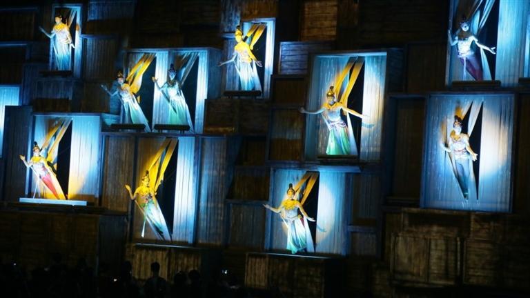 活化敦煌古樂(lè)器、古樂(lè)譜研發(fā)成果的《樂(lè)動(dòng)敦煌》,采用全息投影、3D威亞等高科技手段,以全沉浸式的呈現(xiàn)方式,演繹了西域少年白氏追尋藝術(shù)的動(dòng)人故事,劇中運(yùn)用了來(lái)自敦煌壁畫中復(fù)原的五弦琵琶、排簫、蓮花阮等16件古樂(lè)器,演繹了胡旋舞、腰鼓舞、琵琶舞等多種敦煌舞蹈,還原了敦煌壁畫中的樂(lè)舞盛景。