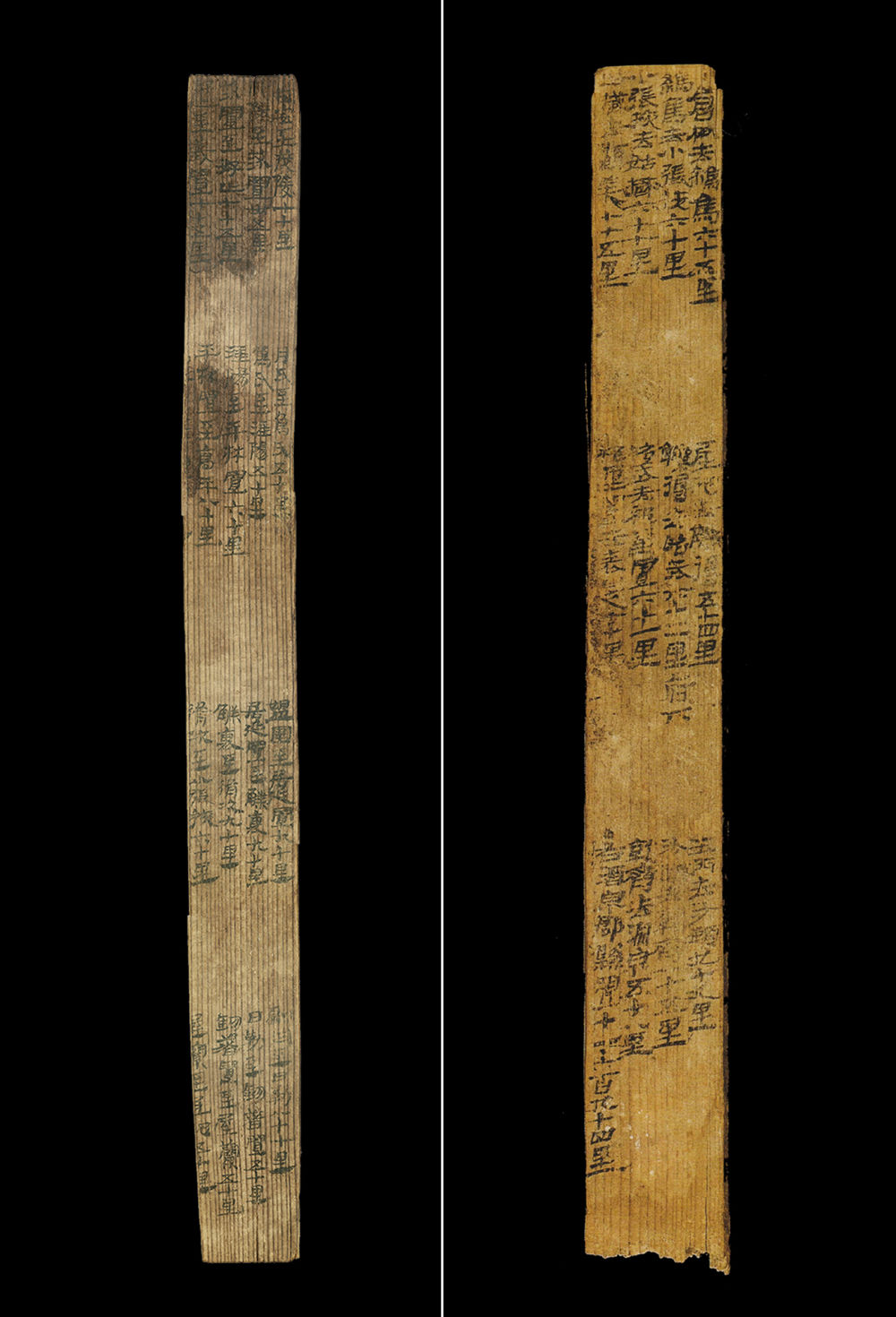 拼版照片:漢簡(jiǎn)《居延里程簡(jiǎn)》(左圖)和《懸泉里程簡(jiǎn)》。1974年出土于今內(nèi)蒙古自治區(qū)額濟(jì)納旗破城子遺址的“居延里程簡(jiǎn)”,詳細(xì)記載了從漢代長(zhǎng)安出發(fā)至張掖郡20個(gè)驛置名稱及間隔里程。1990年出土于敦煌懸泉置遺址的“懸泉里程簡(jiǎn)”,記載了河西走廊地區(qū)武威郡到敦煌郡12個(gè)驛置的詳細(xì)信息。新華社發(fā)(甘肅簡(jiǎn)牘博物館供圖)