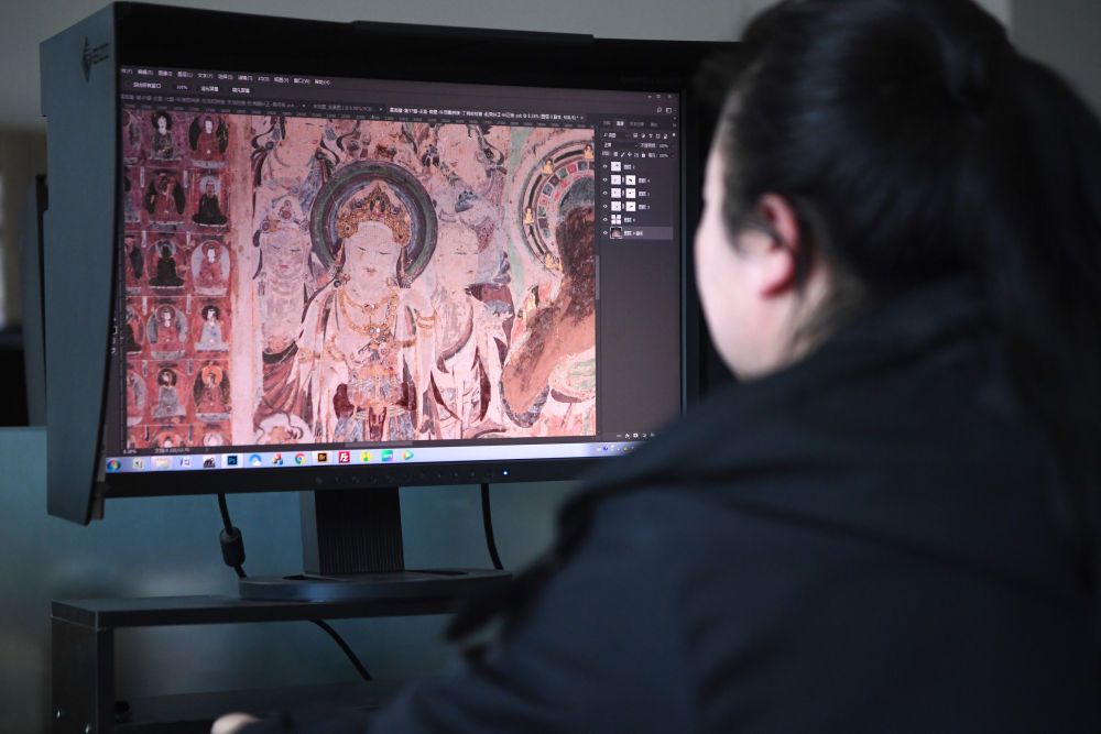 敦煌研究院文物數(shù)字化保護(hù)團(tuán)隊(duì)圖像處理人員年海麗在拼接壁畫(huà)圖像(2023年4月25日攝)。新華社記者 陳斌 攝