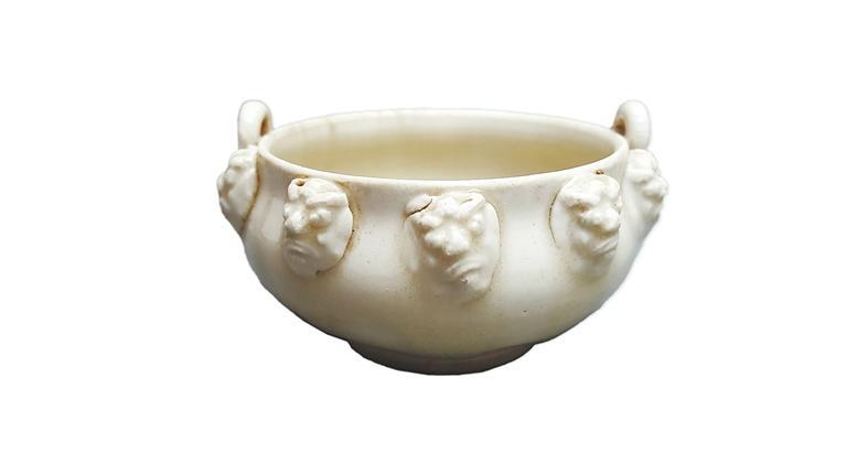 胎白質(zhì)細(xì),內(nèi)外垂?jié){淚痕處閃青,足底無釉,采用模印和堆貼技法。大口短頸,鼓腹內(nèi)收,口外附二個對稱的環(huán)形耳,耳根部飾三個鉚釘形圓餅,兩耳間各貼五個怒目圓睜的頭面像。