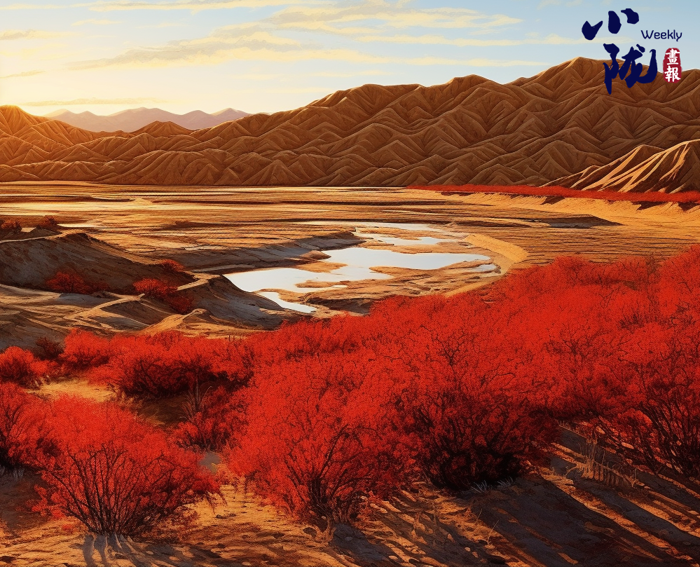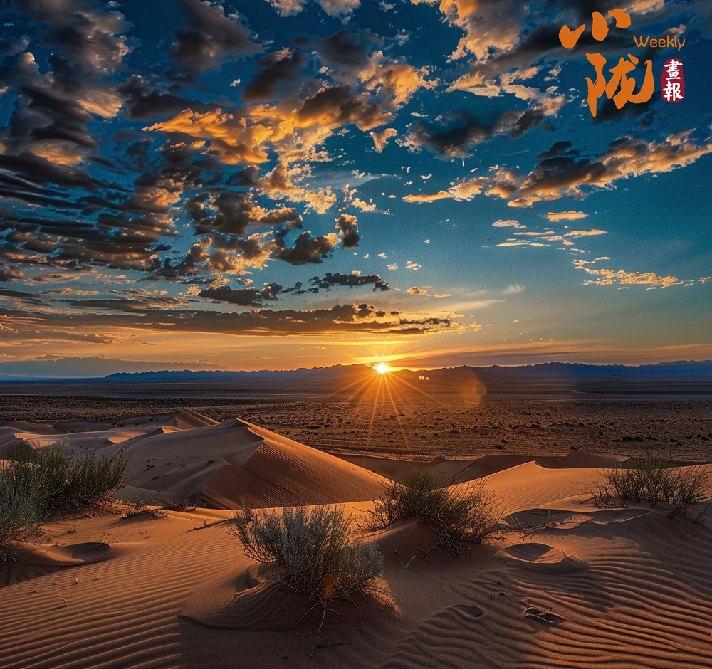 夕陽西下,余暉與戈壁融為一體,紅橙色的光芒將整個地平線染成了一片暖色。在這個時刻,戈壁灘的草木們也似乎感受到了晚霞的美麗,它們輕輕搖擺,似乎在與夕陽共舞。