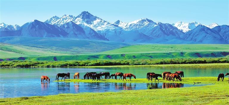 白雪皚皚的祁連山下,一眼望不到邊的大片牧草青翠碧綠,色彩斑斕的野花競(jìng)相開(kāi)放,擁有百萬(wàn)畝草原的山丹馬場(chǎng)如巨幅彩色畫(huà)卷徐徐展開(kāi)。