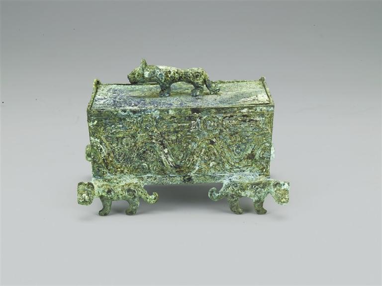 1993年山西省曲沃縣北趙村晉侯墓地62號(hào)墓出土。波曲紋虎足方盒為生活用具,出土于晉穆侯夫人墓。盒為長方形,口徑略大于底徑,斜直壁,頂部有立體的虎形捉手,兩扇小蓋可以開啟,盒下有四虎為四足,虎首朝外。盒四壁上部飾鱗紋,下部飾波曲紋。此盒設(shè)計(jì)精巧,器型較小,紋飾精美,應(yīng)是古代貴族女性用來珍藏小型物件的容器。
