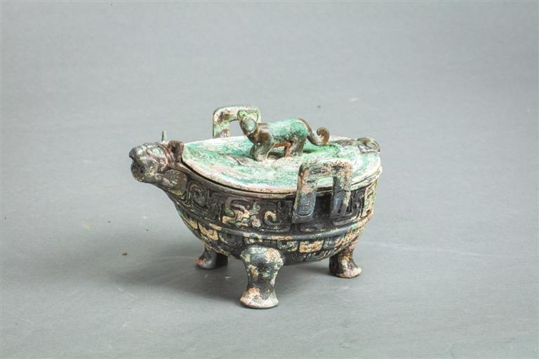 山西省侯馬市上馬村14號(hào)墓出土。器為直口窄平沿,口沿前部有虎頭形管狀流,雙附耳,腹部圓收形成圜底,下承三獸蹄足。捉手的虎頭向左前方斜視,虎尾下垂后向上卷曲,流口虎嘴大張,雙目凝視,雙耳直立,器口沿下飾獸目交連紋,腹部飾重鱗紋。