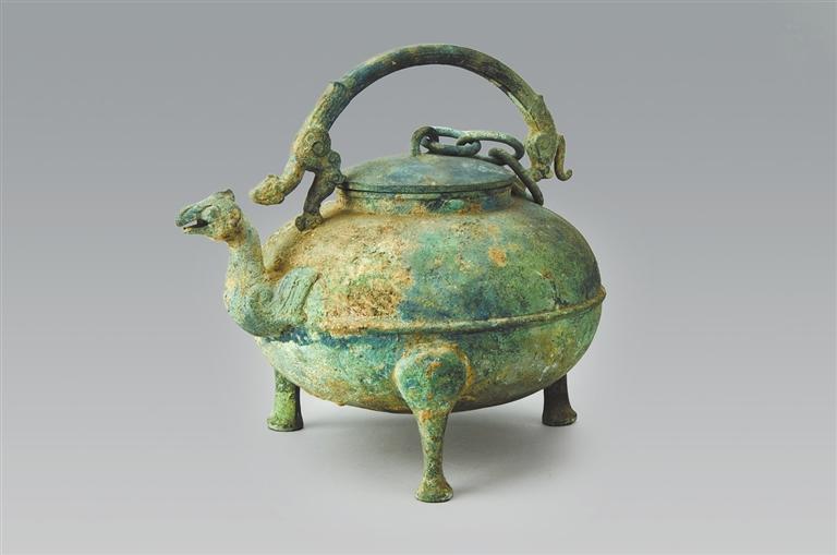 山西省長治市分水嶺36號(hào)墓出土。扁橢圓體曲流形盉,口沿外侈,上為圓雕的振翅鳥形蓋,盉身兩側(cè)飾三周紋飾,上部飾體軀相交的龍紋。
