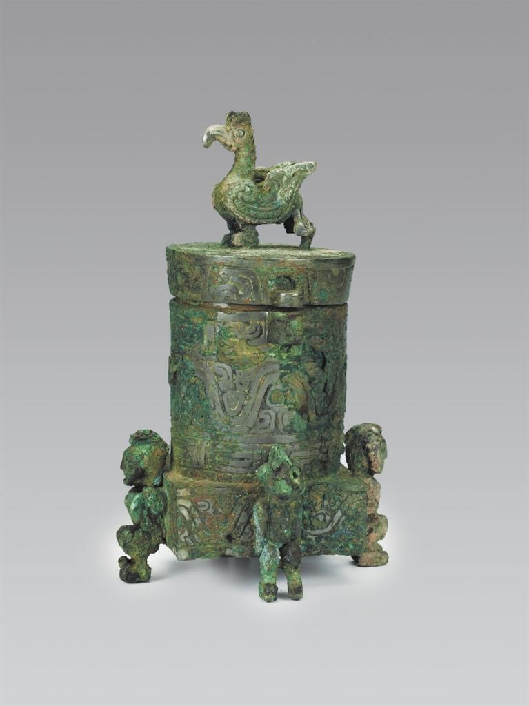山西省曲沃縣北趙村晉侯墓地63號(hào)墓出土。圓筒形,帶蓋,蓋與器體以子母口套合,蓋平頂,上有圓雕立鳥形鈕,鳥彎喙,雙目圓睜,作展翅欲飛狀。器為平口,口沿有一對(duì)貫耳,直壁,方形底座,底座四壁各有一個(gè)人形足以承器體。人發(fā)髻高聳,赤身裸體,屈膝下蹲,作奮力抬舉器物狀,形象寫實(shí)生動(dòng)。方座飾波曲紋,內(nèi)底有兩只小鈴,可發(fā)聲。蓋頂飾斜角云紋一周。蓋沿和口沿飾變形獸體紋,筒腹和方座飾波曲紋,筒下層飾鱗紋一周。這種形制的青銅器尚屬首見,其功用還有待于深入研究,但它獨(dú)特的藝術(shù)造型和裝飾卻可以說是集眾器之長,獨(dú)步天下。