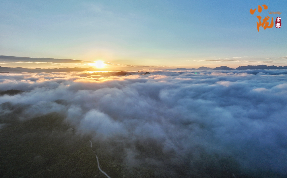 重山峻嶺間,白云如棉花般柔軟,遠(yuǎn)處的群峰在朝陽(yáng)映照和云霧的烘托下,勾勒出一幅綠色畫(huà)卷。