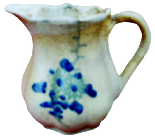 該口杯高10cm,上口手捏黏泥接連,珍珠釉澆注粘連處留有數(shù)滴珍珠釉淚珠。口沿前傾,連口粘痕明顯裸露。通體呈吊南瓜分棱,八道指泥壕顯八股棱條。造型珍瓏靈秀,珍貴之處在于上施淺瑪瑙釉,體面使用藍寶石礦料畫一束盛開的菊花。畫筆嫻熟簡練,富有立體感,且活靈活現(xiàn)。在背面腰中部,用淡青花題“□□”二字,字雖模糊不清,但胎土細膩,瓷壁輕薄又堅硬如骨,胎底色黃中泛紅,瓷體表面青釉中又泛小針褐色點。把手處,窯變?yōu)轵球咀吣嗉y。這種泥紋,沉重古樸,明亮而深沉,是釉層在干燥或燒成時發(fā)生干裂,后在高溫階段又有釉流入填補而形成的。在民國以前,蚯蚓紋曾被作為判斷鈞釉的唯一標準。