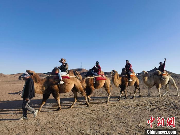圖為留學生在陽關(guān)景區(qū)體驗乘騎駱駝。劉玉桃 攝
