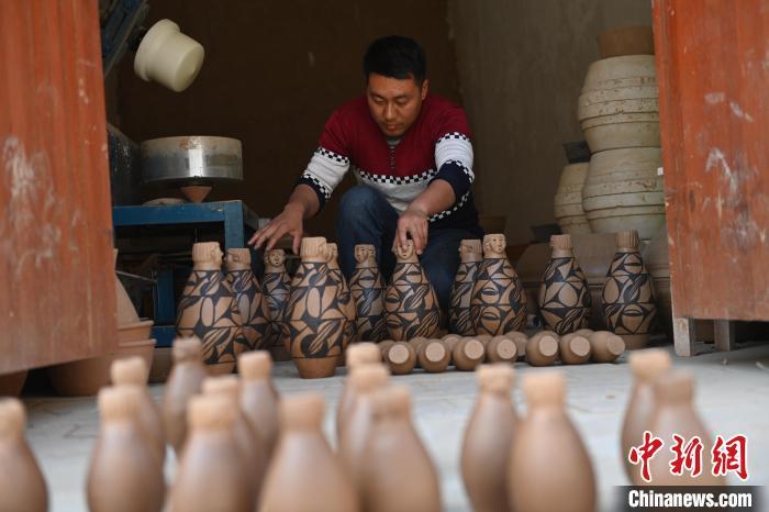 4月11日,甘肅省天水市秦安縣康坡村陶藝車間內,甘肅省級非物質文化遺產(chǎn)名錄秦安陶器燒制技藝天水市級傳承人康曉龍趕制大地灣文創(chuàng)彩陶。李亞龍 攝