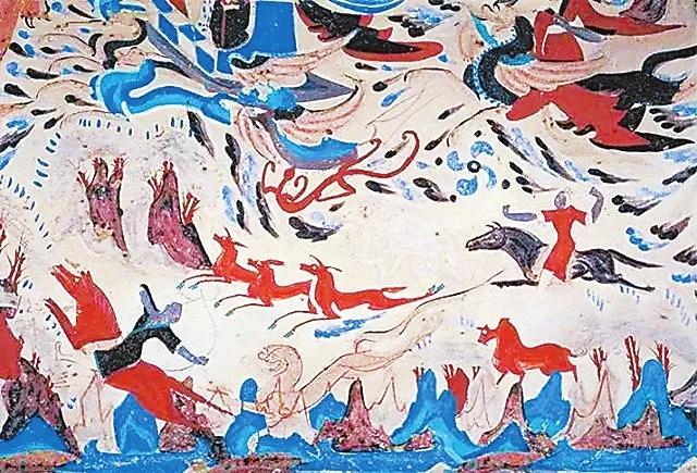 在莫高窟第249窟壁畫中有一幅“行獵圖”:畫面上都是些體型巨大的動(dòng)物,有體態(tài)矯健的猛虎、疾馳俊逸的鹿群、整裝待發(fā)的獅子等,有在奔馳的駿馬上拈弓搭箭窮追不舍的獵人,還有在飛奔的駿馬上淡定轉(zhuǎn)身從容射虎的獵人。整個(gè)畫面既緊張又美好,使人不由得對(duì)畫師精湛的技藝心悅誠(chéng)服。唐代詩人王維在詩作《觀獵》中寫道:“風(fēng)勁角弓鳴,將軍獵渭城。草枯鷹眼疾,雪盡馬蹄輕。忽過新豐市,還歸細(xì)柳營(yíng)。回看射雕處,千里暮云平。”意思是說將軍的獵騎,飛馳在渭城的近郊。風(fēng)中傳來呼嘯的弦聲。已枯的野草,擋不住尖銳敏捷的鷹眼,積雪后飛馳的駿馬馬蹄會(huì)愈加輕盈。據(jù)文獻(xiàn)記載,唐宋時(shí)期人們打獵時(shí)多有一種“西北望,射天狼”的豪情!在莫高窟第85窟壁畫中還有一幅“行獵圖”就形象地反映了唐人狩獵的情景:畫面上的四個(gè)健碩獵人正在整裝出獵,他們著裝統(tǒng)一:頭戴幞頭,身穿缺胯衫,足蹬半腰靴。打獵的裝備也很不同:有人胳臂上架鷹、有人單手牽犬、有人持弓挎箭囊,甚至還有一人手持利斧。