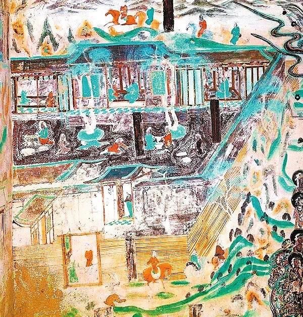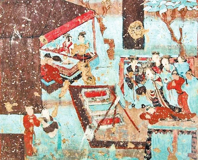 古人會(huì)在一年的歲末舉行一次集體聚會(huì),稱作“建福”。在敦煌文獻(xiàn)《社司轉(zhuǎn)帖》中寫道:“右緣常年建福一日,人各爐餅壹雙,凈粟壹斗。幸請(qǐng)諸公等,帖至限今月廿二日卯時(shí)于安家酒店取齊。”意思是說,只要有可能,每年到了年末大家都要選擇一日來進(jìn)行建福。每家每戶需要按時(shí)把準(zhǔn)備建福的物資送過來。唐朝詩人李白在《客中行》一詩中寫道:“蘭陵美酒郁金香,玉碗盛來琥珀光。但使主人能醉客,不知何處是他鄉(xiāng)。”意思是說蘭陵美酒甘醇甜美,就像郁金香一樣芬芳四溢。興來盛滿玉碗,泛出琥珀光晶瑩迷人。主人端出如此好酒,定能醉倒他鄉(xiāng)之客。飲酒之后哪能分清故鄉(xiāng)與他鄉(xiāng)呢?歲暮聚飲蘊(yùn)含有辭舊迎新、攘兇納吉的美好愿望。在莫高窟第12窟壁畫中有一幅“帳篷酒肆圖”:畫面中圍坐在條形長(zhǎng)桌兩邊正盡興暢飲的客人為七人,還有兩個(gè)熱情忙碌的服務(wù)人員。整個(gè)畫面是一幅酒酣耳熱、興致高昂的歡飲圖。更為氣勢(shì)恢宏、熱鬧非凡的是莫高窟第23窟壁畫中一幅“院落圖”:畫面中分院落之內(nèi)與院落之外兩個(gè)部分,院落之內(nèi)是世俗的世界,畫面上布局著鱗次櫛比的廳堂房屋,有人正在庖廚、有人正在對(duì)弈、有人正在暢聊、有人正在團(tuán)聚,也有人正在說教,總之表現(xiàn)的是我們?nèi)粘I畹陌賾B(tài)。院落之外是佛國(guó)世界,整體呈現(xiàn)出肅穆莊嚴(yán)之感。有趣的是在佛國(guó)與世俗世界中間,畫的是服飾艷麗,騎馬遠(yuǎn)行的人們。