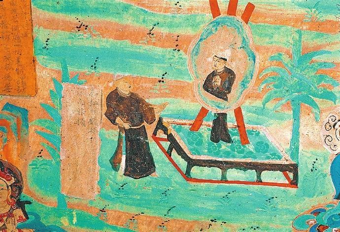 戰(zhàn)國(guó)時(shí)期楚國(guó)詩人屈原在《漁父》一文中寫道:“吾聞之,新沐者必彈冠,新浴者必振衣。安能以身之察察,受物之汶汶者乎?”意思是說我聽說剛洗過頭的人一定會(huì)去彈彈帽子上的灰塵;剛洗過澡的人一定要抖抖衣服的灰塵。怎能讓清白的身體去接觸世俗塵埃的污染呢?當(dāng)年的敦煌人走出溫泉,在身心放松之后,就該靜觀返照自己了。在莫高窟第85窟中有一幅“曲花式鏡圖”:畫面上在一個(gè)正方形鏤空的底座上擺放著一個(gè)巨大的曲花式鏡,鏡子式樣別致,明亮澄澈。藍(lán)色的曲花式樣引人矚目。但畫面上最吸睛的是一位魁梧俊朗身著一襲赭色長(zhǎng)袍的男子,他正在鏡子前仔細(xì)地打量自己,而鏡中映射出他神情凝重的情態(tài)來。原來,古人照鏡除了正衣冠之外,還有反觀自照的含義,在鏡子前良久地注視自己,就是對(duì)自己反省、頓悟的過程。“一年好景君須記”,走過四季,到了歲末,該是每個(gè)人回望來時(shí)路,展望前方的時(shí)候了。