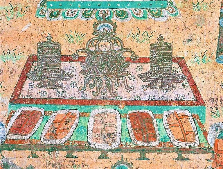 宋朝詩人陸游在《食粥》一詩中寫道:“世人個(gè)個(gè)學(xué)長(zhǎng)年,不悟長(zhǎng)年在目前。我得宛丘平易法,只將食粥致神仙。”意思是說人人都期盼長(zhǎng)壽,怎么也沒有想到,我就成了長(zhǎng)壽之人。如果讓我總結(jié)一下我長(zhǎng)壽的秘訣,那就是我喝的粥多而已。想想冬天到了,天寒地凍,喝碗粥,渾身上下暖烘烘的多美啊??墒窃诙鼗捅诋嬂?,人們?cè)诙静皇呛戎啵呛葻崤D?。在莫高窟?46窟壁畫中有一幅“擠牛奶圖”:畫面上一頭健碩的母牛正在被人擠奶,它回首望向擠奶者。在它的身下,還有一只小牛犢正貪婪地望著擠奶者。兩頭牛都憨態(tài)可掬、萌蠢可愛。漫天飛雪中,煮沸的牛奶溫暖著漫長(zhǎng)冬季的每時(shí)每刻。在莫高窟第302窟中有一幅“湯水浴圖”。湯水就是溫泉。畫面上在樹木掩映之下有一池溫泉,有一大一小兩個(gè)人正沉浸在溫泉沐浴的歡快之中??梢?,伴著紛飛的大雪泡個(gè)溫泉,不是只有今天才有的享受;在千年之前的敦煌,人們就已經(jīng)開始修建溫室浴池,而且引水排水的技術(shù)已經(jīng)較為完善。院落依依、親朋融融、池水湯湯、筋骨軟軟,逸興悠悠。