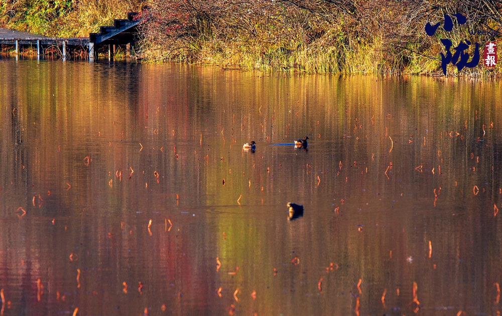 湫水深不可測(cè),湫池依偎在深林密樹旁邊,湫面蕩起縷縷波紋,浮光泛金,一群悠閑的野鴨在水面上游來(lái)游去?!?/p>