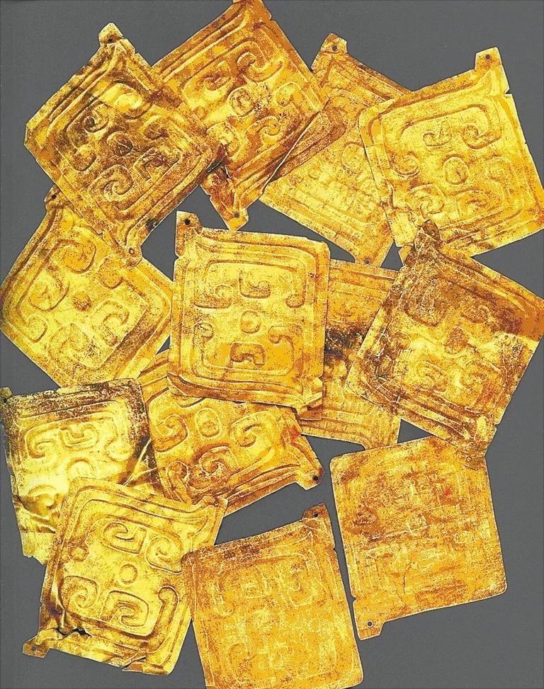 1994年春,陜西省考古研究所所長韓偉在法國、比利時訪問期間,見到了一批從香港過來的金飾片和一對金虎。韓偉先生對這組金飾片從器形、紋飾進行了分析,并參考蘇黎世研究員莫爾夫人從金虎內(nèi)提取的木制標本碳-14檢測結(jié)果,認為這批金飾片為西周晚期秦人首領(lǐng)秦仲或秦莊公墓棺上的裝飾物。