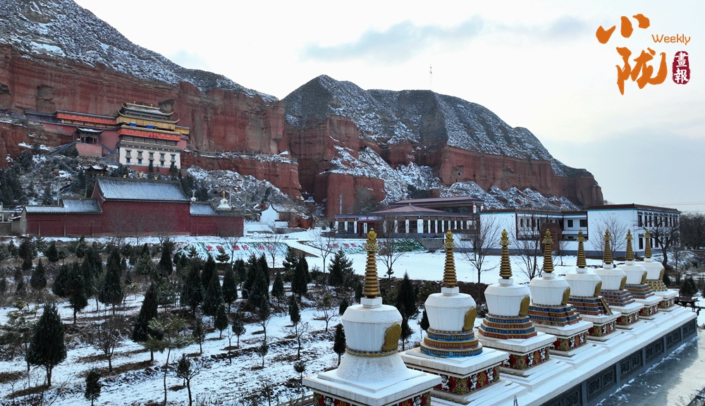 丹霞映白雪,一眼望千年。冰雪覆蓋的羅家洞寺,更顯得莊嚴肅穆,充滿了禪意。白色小塔與懸崖絕壁之上的窟龕遙相呼應,無比和諧。