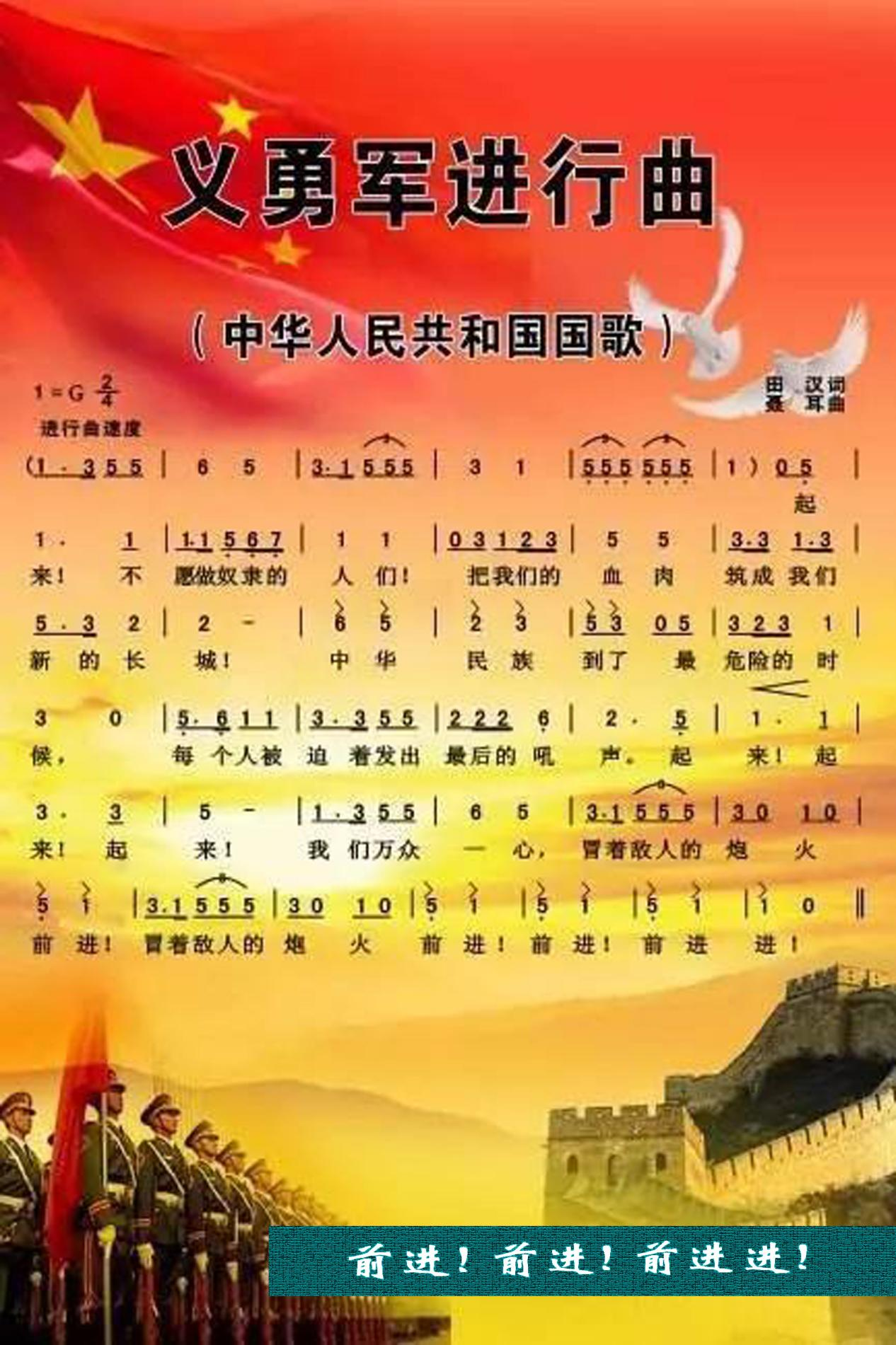 ?、嗲斑M(jìn)!前進(jìn)!前進(jìn)進(jìn)?。骸读x勇軍進(jìn)行曲》這一段歌詞是作曲家聶耳改定的。為了使歌曲曲調(diào)和節(jié)奏更加有力,聶耳把田漢原來的“我們?nèi)f眾一心,冒著敵人的飛機(jī)大炮前進(jìn)。前進(jìn)!前進(jìn)!前進(jìn)!”改為“我們?nèi)f眾一心,冒著敵人的炮火,前進(jìn)!冒著敵人的炮火,前進(jìn)!前進(jìn)!前進(jìn)進(jìn)!”全國政協(xié)委員、國家一級指揮、解放軍軍樂團(tuán)前團(tuán)長于海曾談到:“前進(jìn),前進(jìn),前進(jìn)進(jìn)!”這七個字堪稱國歌的點睛之筆。“前進(jìn)進(jìn)”的節(jié)奏感,凸顯了國歌精神的進(jìn)行時態(tài)。正是這種精神一直在指引我們,激勵著我們。