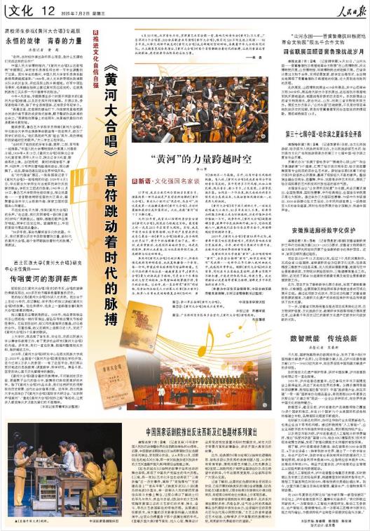6月30日晚,北京音樂廳內(nèi),京津冀藝術(shù)家會(huì)聚一堂,奏響交響音樂會(huì)《黃河》;不久前,廣東深圳8個(gè)合唱團(tuán)、300余名歌者共同演唱《黃河大合唱》,吸引近120萬(wàn)網(wǎng)友線上觀演……80多年來,從烽火硝煙中誕生的《黃河大合唱》成為跨越時(shí)空的回響,承載著中華兒女的共同記憶。從主題展覽到各類演出,《黃河大合唱》的每個(gè)音符都跳動(dòng)著時(shí)代的脈搏,讓我們重溫這首抗戰(zhàn)歌曲,感受經(jīng)典作品傳承的永恒力量。