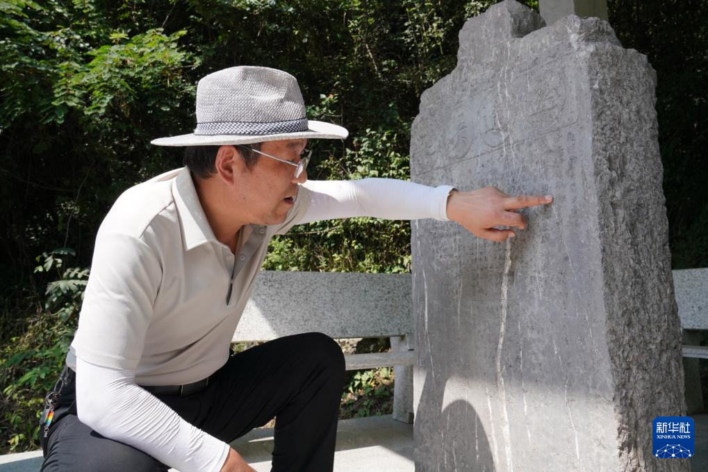 7月14日,在青泥嶺上,徽縣博物館文博副研究館員曹鵬雁在介紹一塊刻有“遠通吳楚”字樣的清代石碑。新華社記者 馬寧 攝