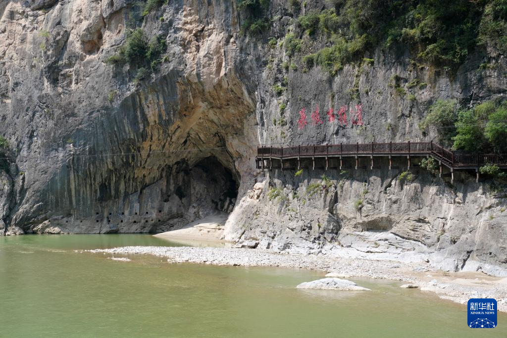 7月15日拍攝的青泥嶺下嘉陵古棧道的棧道孔遺存和復原的棧道。新華社記者 馬寧 攝