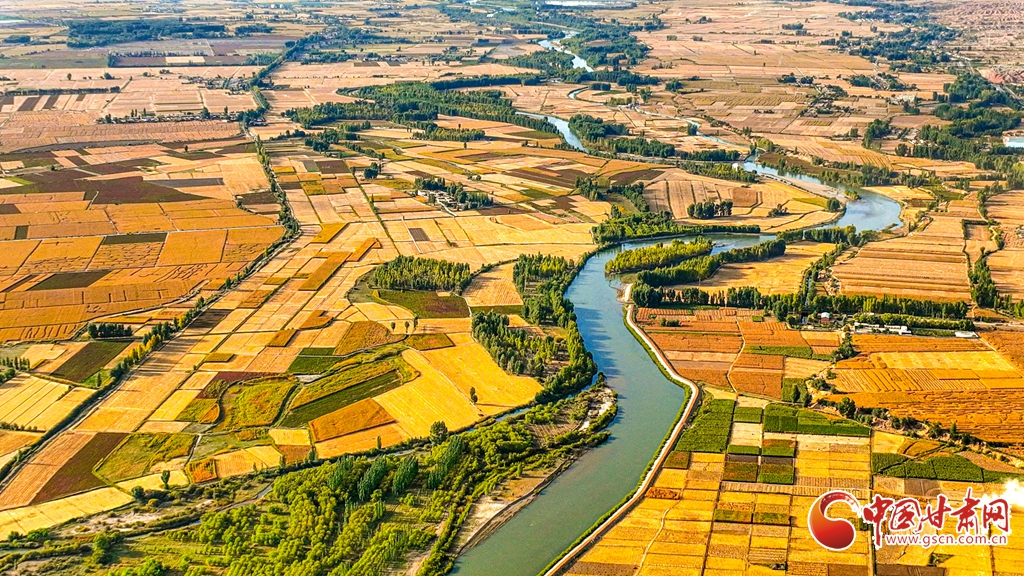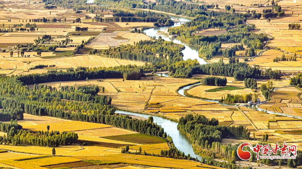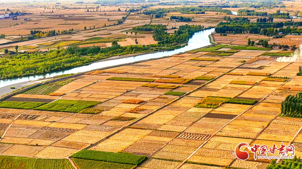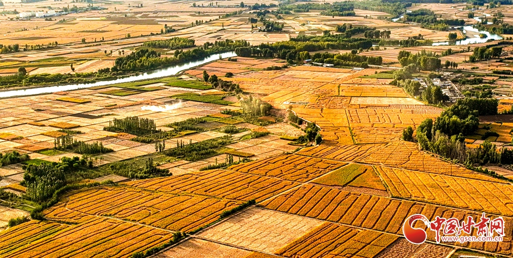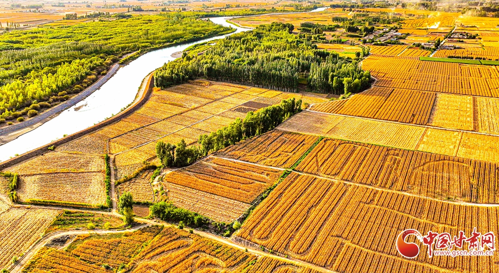 9月26日傍晚,夕陽(yáng)映照下的黑河張掖臨澤縣鴨暖鎮(zhèn)段,蜿蜒流淌的河水與兩岸鋪滿(mǎn)金色的大地交相輝映,盡顯盎然生機(jī),共同勾勒出一幅金秋豐收的壯美畫(huà)卷。
