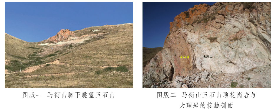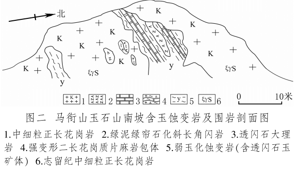 馬銜山玉礦分布在馬銜山東南部的玉石山(圖版一),海拔3028米。山上出露的地質(zhì)體主要為古元古界馬銜山巖群、中元古代片麻二長(zhǎng)花崗質(zhì)巖[3]和志留紀(jì)正長(zhǎng)花崗巖及正長(zhǎng)巖。馬銜山巖群的巖性為黑云斜長(zhǎng)片麻巖、變粒巖、斜長(zhǎng)角閃巖和白云質(zhì)大理巖,巖石普遍遭受了韌性變形,變余糜稜?zhēng)r發(fā)育。志留紀(jì)巖漿侵入期后熱液活動(dòng)較強(qiáng),石英脈細(xì)脈發(fā)育,局部見(jiàn)螢石礦化或礦床[4]。玉礦化主要產(chǎn)于馬銜山巖群與志留紀(jì)正長(zhǎng)花崗巖和正長(zhǎng)巖接觸帶上(圖版二),具體賦存在與白云質(zhì)大理巖的接觸部位,是正長(zhǎng)花崗巖及正長(zhǎng)巖與鎂質(zhì)大理巖接觸交代蝕變的產(chǎn)物[5]?;◢弾r與片麻巖、變粒巖和斜長(zhǎng)角閃巖接觸界線附近巖石雖有蝕變,但不見(jiàn)玉化蝕變巖或玉石出露。在近山頂開(kāi)采玉石揭露的一個(gè)地質(zhì)剖面清晰地顯示了這些特征(圖二)。該剖面大致呈東西走向,長(zhǎng)約50米,馬銜山巖群多呈殘留體出露,斜長(zhǎng)角閃巖綠泥綠簾石化強(qiáng)烈,大理巖普遍發(fā)生蝕變,形成透輝透閃石大理巖,緊靠花崗巖接觸地帶發(fā)育窄窄的透閃石玉礦帶?,F(xiàn)在人們找玉,也主要在該剖面上的花崗巖和鎂質(zhì)大理巖的接觸帶上鑿洞,在接觸帶上見(jiàn)有多處采挖玉石的洞穴。在該剖面西側(cè)約50米,發(fā)育有正長(zhǎng)巖與大理巖的混染帶,肉紅色正長(zhǎng)巖中包裹混染著大量灰綠色透閃透輝大理巖,部分已蝕變?yōu)橥搁W透輝石巖,且質(zhì)地較細(xì)膩,成為半玉化巖石。剖面和周?chē)刭|(zhì)特征表明,玉礦的形成是早古生代志留紀(jì)花崗質(zhì)雜巖體侵入到古元古代鎂質(zhì)大理巖,發(fā)生接觸交代蝕變作用的結(jié)果,在兩種巖石接觸帶形成玉礦體。但并不是蝕變帶中的巖石都是透閃石玉石,透閃石玉在蝕變帶中多呈雞窩狀或不規(guī)則狀分布,少量呈脈狀出露。從剖面及部分采坑的規(guī)模來(lái)看,玉礦體向深處有變大、變好的趨勢(shì),這主要受控于接觸面產(chǎn)狀,在傾角較緩處礦體相對(duì)較大。橫向上在背離接觸面方向圍巖具有從透閃石玉到透閃透輝石玉、透閃透輝石大理巖再到含透閃石大理巖的變化特征,反映了交代蝕變強(qiáng)度與接觸帶溫度及熱液成分變化的密切關(guān)系。從玉礦體到蝕變圍巖由于成分和結(jié)構(gòu)的變化出現(xiàn)一系列不同類(lèi)型的玉石或巖石。我們?cè)谄拭嫔喜杉揭恍┬K的淡綠色玉料(圖版三)和出露較寬的微晶大理巖,經(jīng)偏光顯微鏡下薄片鑒定和XRF檢測(cè),確定有透閃石玉、透輝透閃玉、透閃透輝石玉、透閃透輝石大理巖和含透閃石大理巖等,這與馬家窯遺址出土的齊家文化時(shí)期大部分玉質(zhì)品玉料類(lèi)型基本一致[6]。部分地段近礦圍巖還有透輝石巖、透輝矽卡巖、矽卡巖化大理巖、蛇紋石化大理巖、斜長(zhǎng)透輝石巖等。玉石山的采洞(坑)由于資源與環(huán)境保護(hù)的要求,大多已被填埋,但仍可見(jiàn)采坑殘留的位置。采洞(坑)均位于大理巖與正長(zhǎng)花崗巖接觸帶靠近大理巖一側(cè),這也間接顯示了玉礦體的位置。此外,玉石山花崗巖中石英細(xì)脈較發(fā)育,局部可見(jiàn)螢石礦化,反映了花崗巖侵入期后低溫?zé)嵋夯顒?dòng)仍較強(qiáng),對(duì)玉礦也有一定的改造影響。
