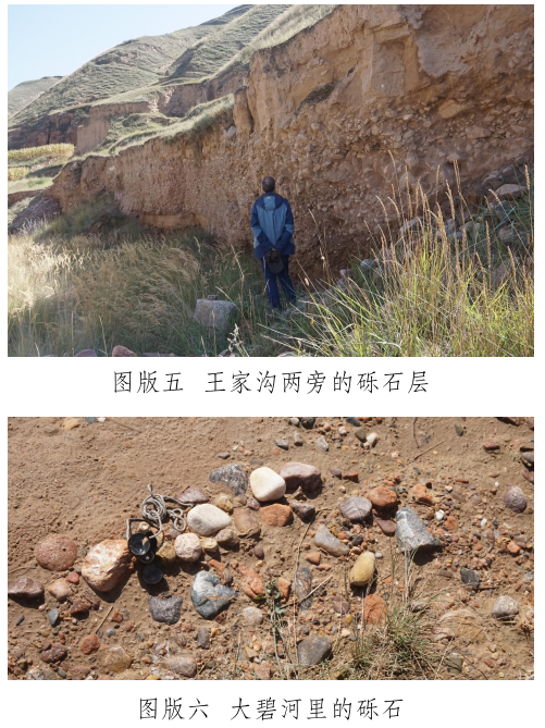 玉石山南麓有一條自東向西流過(guò)峽口鎮(zhèn)注入洮河的河——大碧河,《狄道州志》里稱(chēng)為“打璧河” [12]。玉石山和山下大碧河之間有幾條溝,這些溝是上玉石山的必經(jīng)道路,也是雨水夾帶山上的石頭注入大碧河的通道。在甘肅臨洮馬家窯文化研究院李家功的引領(lǐng)下,我們對(duì)大碧河中下游和通往玉石山的三條支溝進(jìn)行了較系統(tǒng)的調(diào)查,調(diào)查方法是在訪問(wèn)當(dāng)?shù)赜嘘P(guān)人員的基礎(chǔ)上,進(jìn)行野外實(shí)地考察。大碧河連接玉石山的支溝主要有三條:第一條大溝是王家溝,是玉石山和峽口鎮(zhèn)之間的通道,大雨過(guò)后附近的村民往往會(huì)在這條溝里撿到玉石。在王家溝靠近玉石山的茨泉子村,十多戶(hù)村民都拿出自己在溝中揀到的十余件山流水玉料(圖版四)供我們觀察、檢測(cè)。玉料大小不一,大者長(zhǎng)軸約30厘米,多呈次圓狀,均有玉皮,內(nèi)部質(zhì)地多細(xì)膩,肉眼鑒定和XRF檢測(cè)結(jié)果表明,玉石主要包括黃綠色(含草花)透閃石玉、透輝透閃石玉及透閃石大理巖,另外還有螢石料。王家溝下游匯入大碧河入口段,發(fā)育三級(jí)階地,前人使用大型機(jī)械開(kāi)挖二、三級(jí)階地礫石層(圖版五),據(jù)說(shuō)在其中找到較多玉料,現(xiàn)政府已叫停。在階地礫石層中我們也撿到淺黃綠色透輝透閃石大理巖及半玉化的大理巖礫石,這些礫石是玉石山玉礦的近礦圍巖。王家溝匯入大碧河,因此大碧河中也可以撿到從王家溝滾落的玉石山上的玉石和其它巖石。我們?cè)诖蟊毯訊{口鎮(zhèn)段揀到較多直徑約3~5厘米來(lái)自玉石山的透閃石大理巖,巖石磨圓度高,成球狀或橢球狀,質(zhì)地較細(xì)膩。據(jù)當(dāng)?shù)厝酥v,也有人在大碧河峽口鎮(zhèn)段撿到過(guò)小塊的玉石;第二條溝是小溝——漆家溝,位于王家溝西面,雖位于玉石山正面,但鮮有聽(tīng)到在溝里撿到玉石的消息;第三條溝是王家溝東面的石景峽,距離玉石山相對(duì)較遠(yuǎn),其溝腦是玉石山的東延部分。《狄道州志》里載“打璧河,在州北三十里,源出石井峽,即打璧谷” [13]。這里的“石井峽”可能就是現(xiàn)在所說(shuō)的“石景峽”,峽中腰有水冒出。但現(xiàn)在的大碧河不源于石景峽,而是源于洮河和渭河的分水嶺。石景峽雖可能是史籍上的打璧谷,且在峽里也撿到了透閃石大理巖礫石,但沒(méi)有發(fā)現(xiàn)玉石器和玉料。