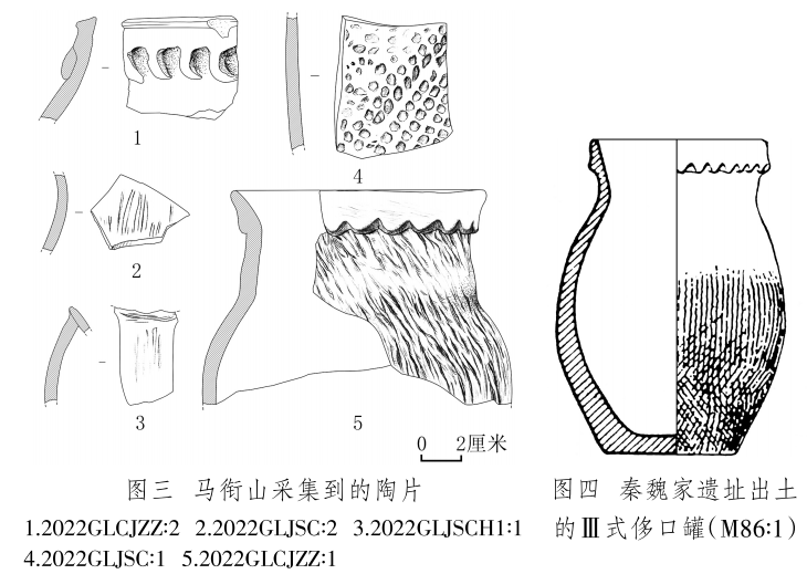 陶片 2片,2022GLCJZZ∶1,罐殘片,夾砂紅陶,腹部以下缺失。侈口,上有煙熏痕跡。短頸,頸上部有一圈鋸齒狀凸飾,鼓腹,頸部和腹部滿(mǎn)飾粗繩紋。復(fù)原口徑12、器壁厚0.6~1、殘高10厘米(圖三,5)。與秦魏家遺址出土的齊家文化Ⅲ式侈口罐(圖四)[16]形制相似。2022GLCJZZ∶2,罐口沿殘片,夾砂紅陶??谘叵掠性卵罓罡郊佣鸭y??谘貧堥L(zhǎng)5.3、殘高4.8、厚0.7厘米(圖三,1)。