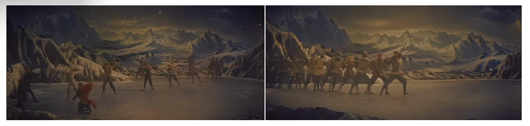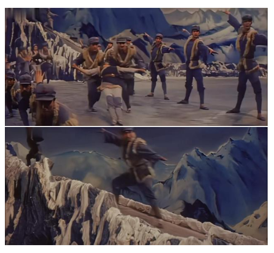 在表現(xiàn)行軍征程時,舞者以身體前傾的大跨步姿態(tài),沿群山布景走出巨大的“S”型曲線。這不是簡單的隊形變換,它首先在視覺上營造出千軍萬馬綿延不絕的雄渾意象。同時,“S”形曲線本身藝術(shù)化地傳達了“道路是曲折的,前途是光明的”這一革命哲理。舞者整齊劃一、重心下沉的堅定步伐,與沙幕光影營造出的風(fēng)沙漫天效果相結(jié)合,共同體現(xiàn)紅軍在艱難險阻中依然定向不移的鋼鐵意志。