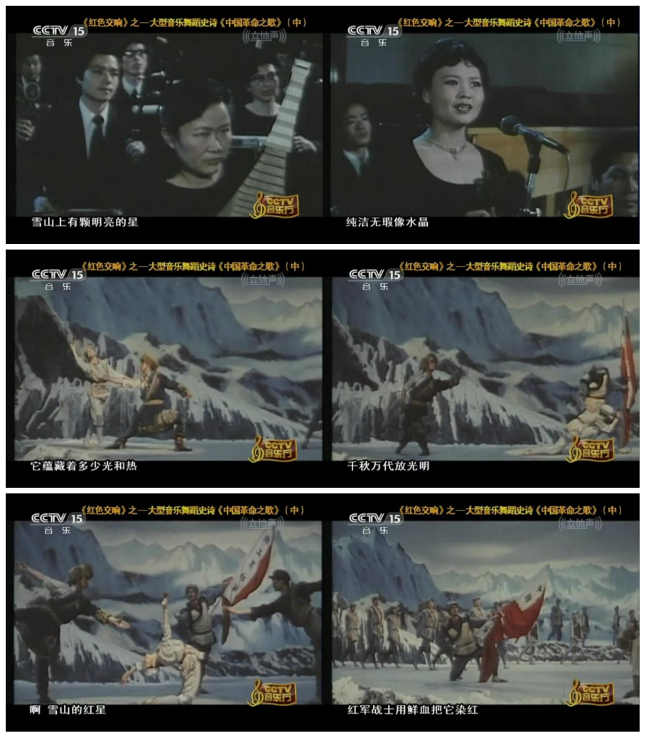 而在音樂與舞蹈的融合道路上,創(chuàng)作于1984年的大型音樂舞蹈史詩《中國革命之歌》,邁向了一種更為宏大的藝術(shù)形態(tài)。作品融舞蹈、音樂、朗誦與舞臺視覺于一體,以全景敘事回溯革命征程。其中第三時期的片段《紅軍不怕遠征難》,以“雪山紅星”為核心意象,在交響樂、合唱與舞蹈的交織中,唱響了那段艱苦卓絕的歷程。