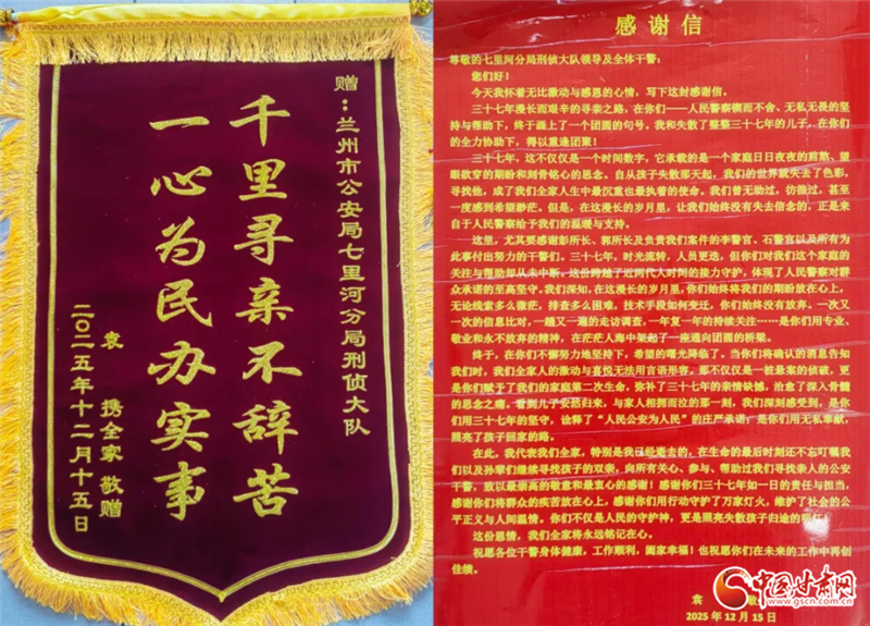 2025年12月15日,袁女士夫婦專(zhuān)程帶著兩面印有“千里尋親不辭苦 一心為民辦實(shí)事”的錦旗和飽含深情的感謝信,分別來(lái)到分局刑偵大隊(duì)、龔家灣派出所:“謝謝你們,幫我找回了失散半生的兒子,圓了我們?nèi)业膱F(tuán)圓夢(mèng)!”