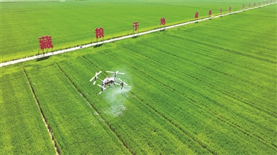 近年來,江蘇省宿遷市宿豫區(qū)多措并舉推動耕地保護(hù)責(zé)任落實(shí),加快現(xiàn)代農(nóng)業(yè)產(chǎn)業(yè)園核心區(qū)建設(shè),保障糧食穩(wěn)產(chǎn)增產(chǎn)。圖為近日,在該區(qū)新莊小麥單產(chǎn)提升示范區(qū),無人機(jī)正在進(jìn)行植保噴灑作業(yè)。朱冠軍 攝