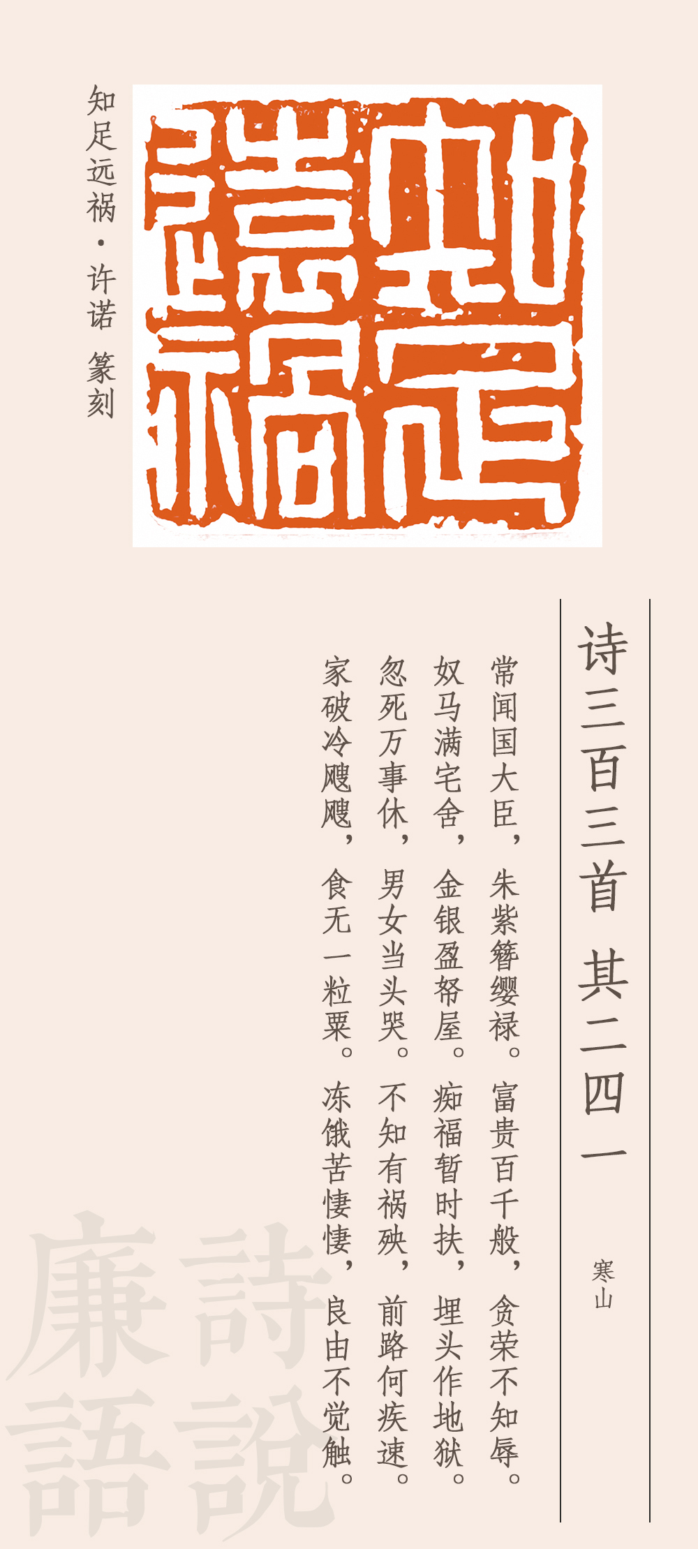 這首詩(shī)是諷刺高官貪圖富貴、聚斂財(cái)物的。他說(shuō),有些國(guó)之大臣,穿戴尊榮,好不威風(fēng),享受千般榮華富貴,卻一點(diǎn)兒都不顧及廉恥榮辱,家中擁有大量駿馬奴仆,屋子里堆滿(mǎn)金銀財(cái)寶,自以為這是在享福,其實(shí)是在給自己挖墳?zāi)沟鬲z。一旦死去,萬(wàn)事皆休,富貴是無(wú)法永久保留的。如果因貪腐而遭受禍殃,那下場(chǎng)就會(huì)很慘。家破人亡,挨凍受餓,凄風(fēng)苦雨,苦不堪言。最后一句卒章顯志:之所以會(huì)有這樣的遭遇和結(jié)局,是因?yàn)闆](méi)有悟透取禍的原因。這個(gè)原因從前面所述來(lái)看,就是太貪婪、不知足。