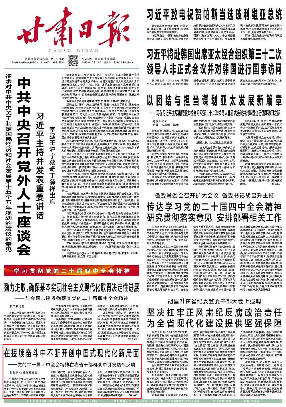 中國共產(chǎn)黨第二十屆中央委員會第四次全體會議,于10月20日至23日在北京舉行。黨的二十屆四中全會精神在全省廣大黨員和干部群眾中引發(fā)熱烈反響。大家一致認(rèn)為,黨的二十屆四中全會是在向第二個百年奮斗目標(biāo)進軍的新征程上舉行的一次十分重要的會議。“十五五”時期是基本實現(xiàn)社會主義現(xiàn)代化夯實基礎(chǔ)、全面發(fā)力的關(guān)鍵時期。全會對未來五年我國發(fā)展作出頂層設(shè)計和戰(zhàn)略擘畫,是乘勢而上、接續(xù)推進中國式現(xiàn)代化建設(shè)的又一次總動員、總部署。大家一致表示,要把學(xué)習(xí)好、宣傳好、貫徹好黨的二十屆四中全會精神作為當(dāng)前和今后一個時期的重大政治任務(wù),深入學(xué)習(xí)貫徹全會精神和習(xí)近平總書記重要講話精神,把思想和行動統(tǒng)一到黨中央決策部署上來,只爭朝夕、奮發(fā)進取,一步一個腳印把全會描繪的“十五五”時期經(jīng)濟社會發(fā)展宏偉藍(lán)圖變?yōu)槊篮矛F(xiàn)實,不斷開創(chuàng)以中國式現(xiàn)代化全面推進強國建設(shè)、民族復(fù)興偉業(yè)新局面。