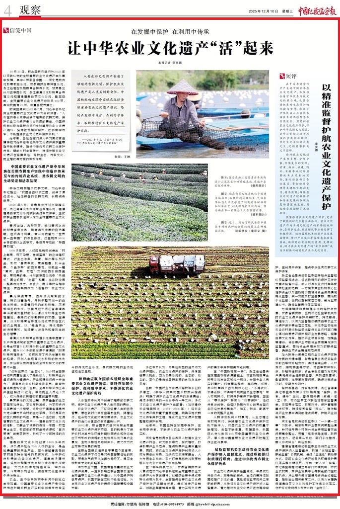 紀檢監(jiān)察機關主動將農(nóng)業(yè)文化遺產(chǎn)保護納入監(jiān)督重點,推動職能部門積極履行職責,推進中華優(yōu)秀農(nóng)耕文化保護傳承